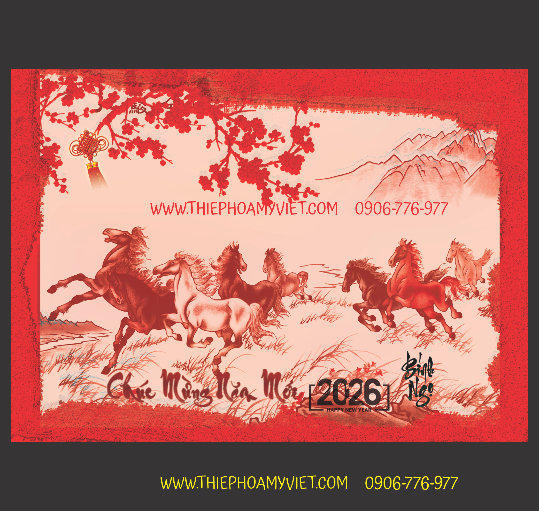 Công ty in thiệp chúc mừng Tết Bính Ngọ 2026 kèm lời chúc gửi thông điệp tới khách hàng. Nhận hỗ trợ thiết kế thêm logo in mặt ngoài thiệp, duyệt in có thiệp trong ngày