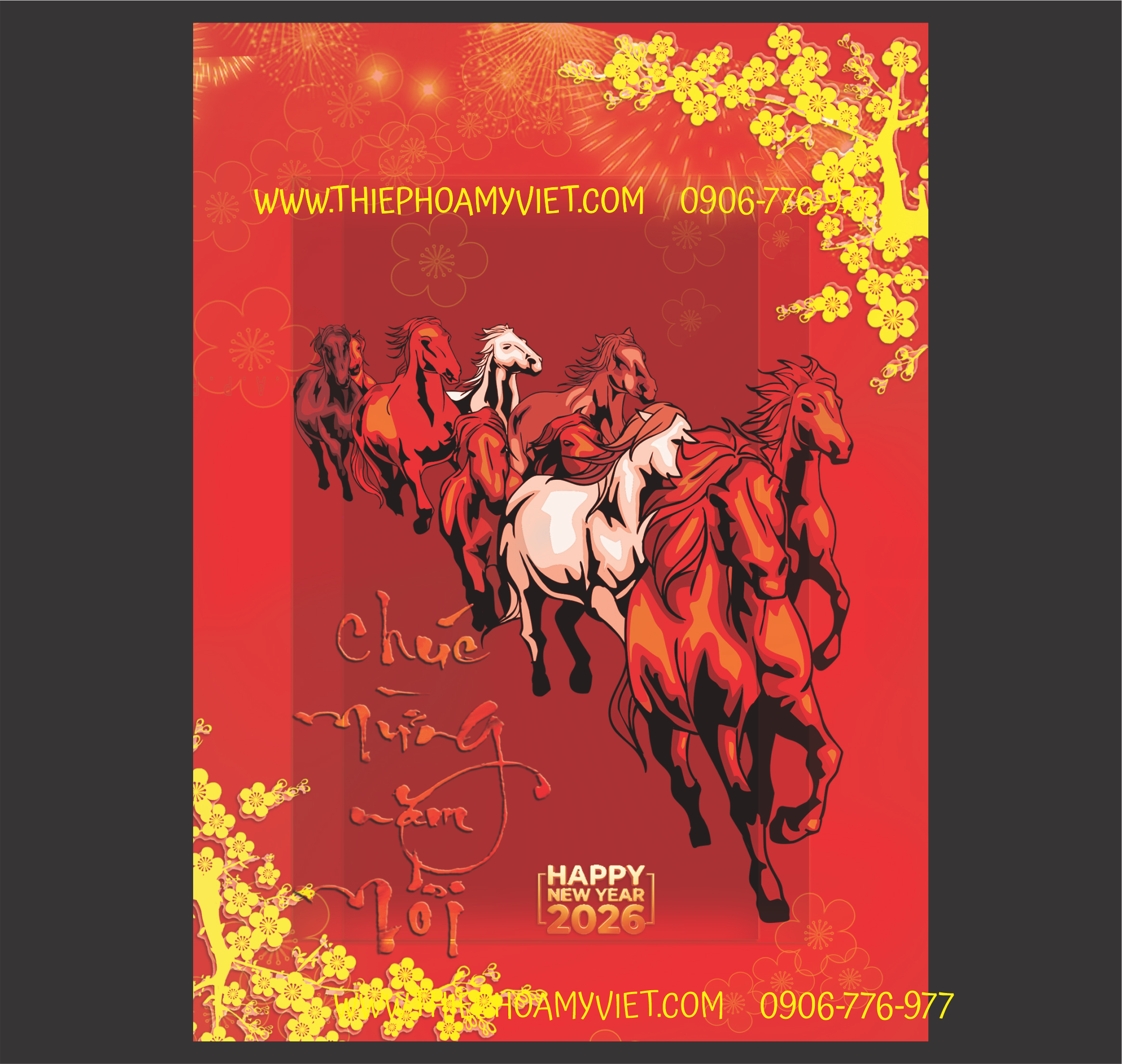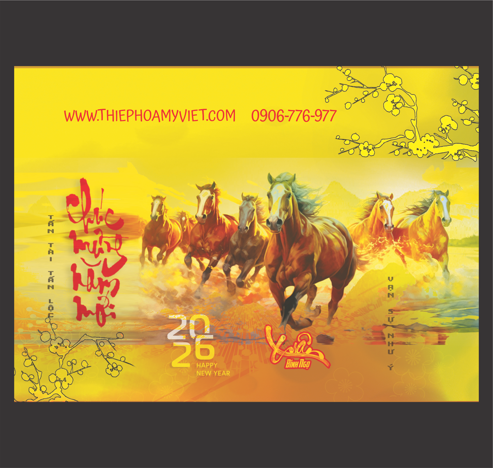 In thiệp chúc tết năm bính ngọ 2026 cùng thông điệp mã đáo thành công gửi tới khách hàng, công ty thiệp Hoa Mỹ Việt nhận thiết kế thêm logo doanh nghiệp in mặt ngoài thiệp.