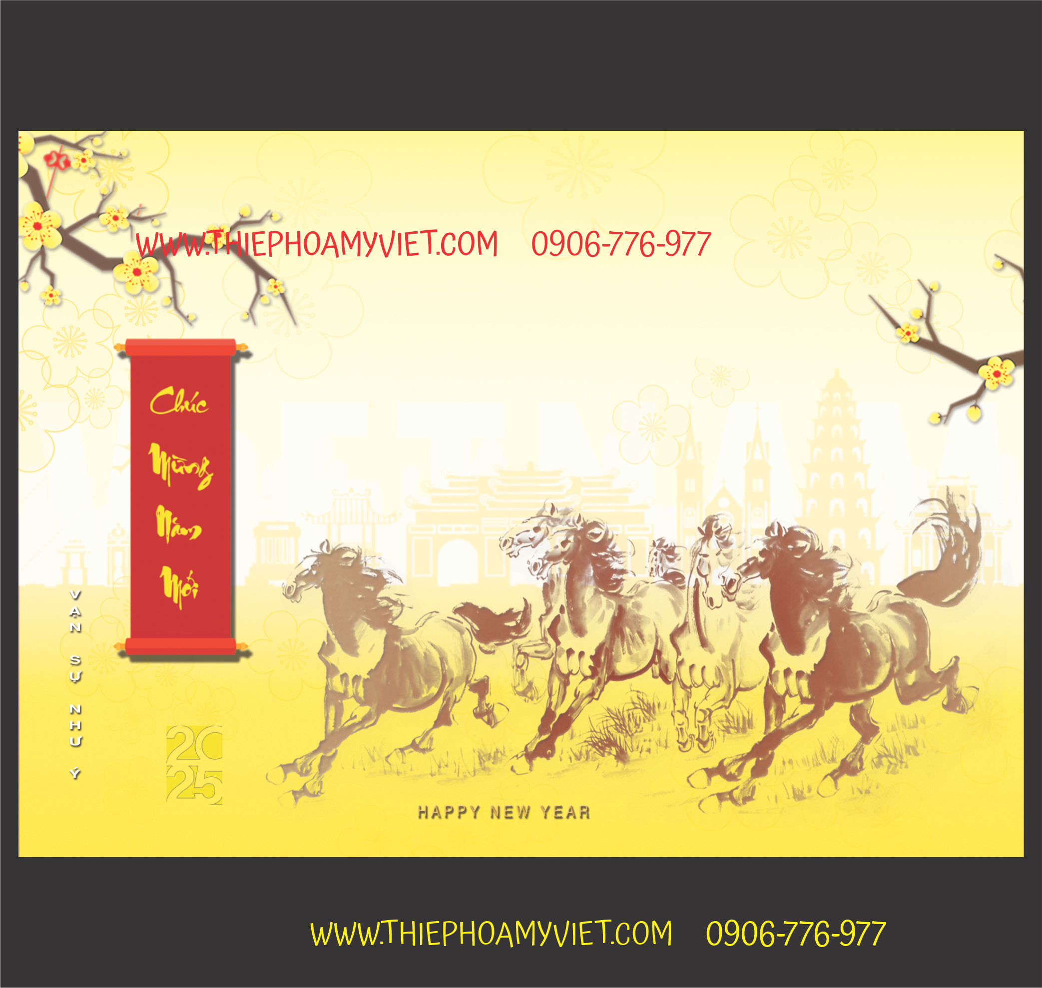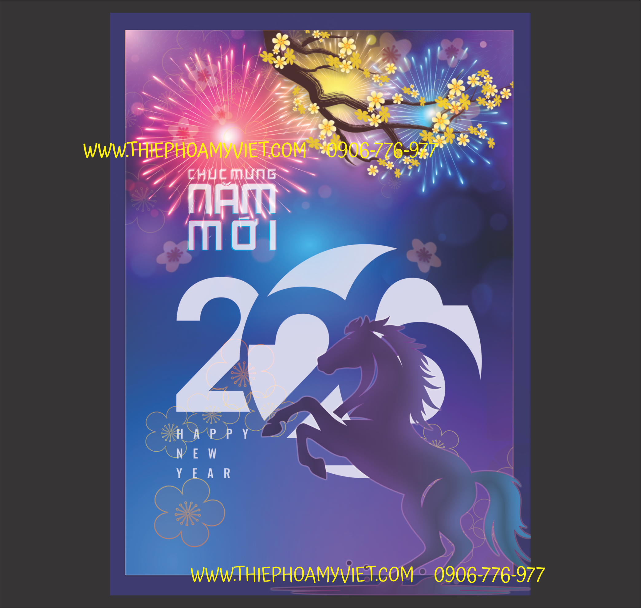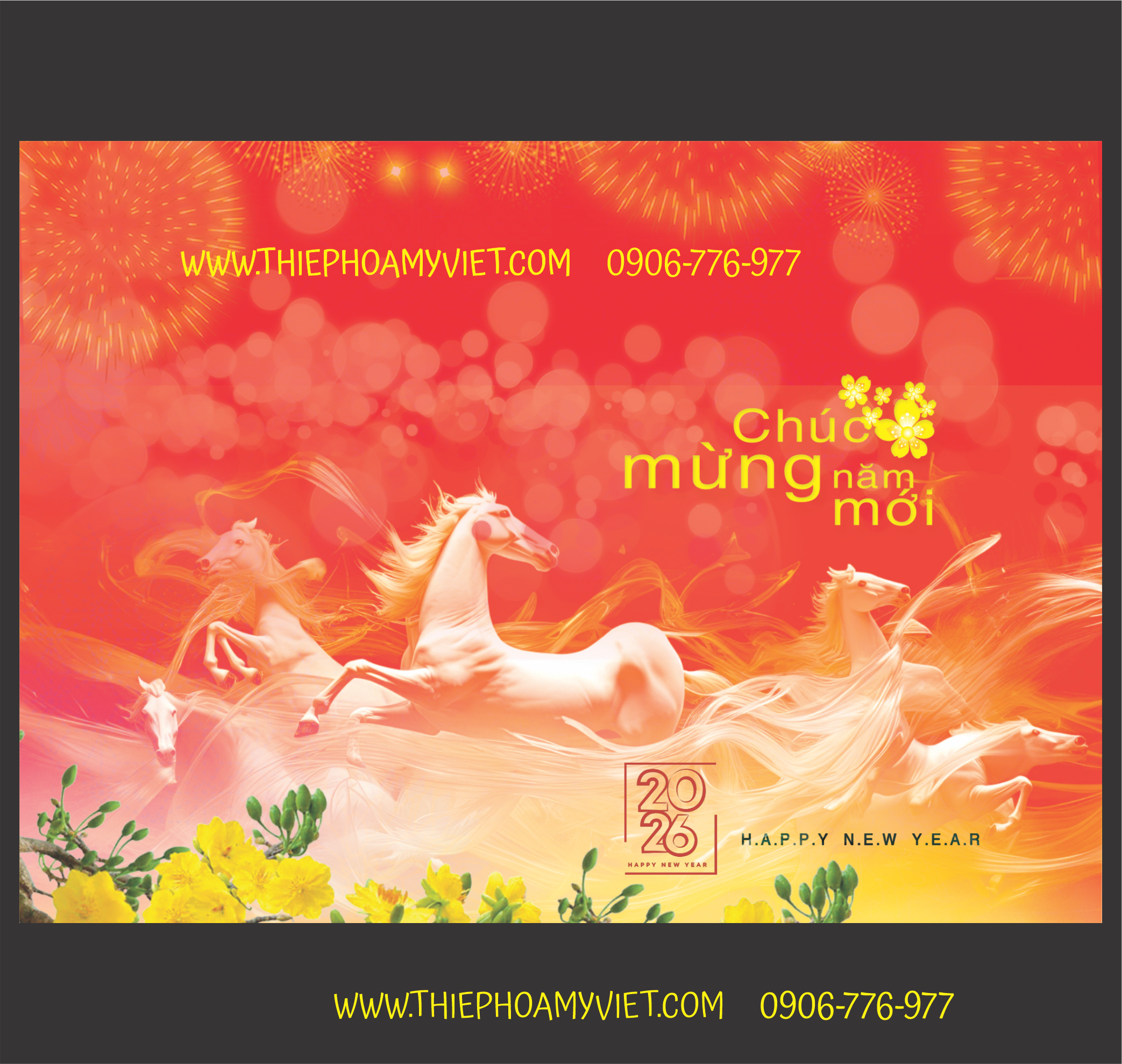 Thiệp chúc tết mẫu đẹp năm bính ngọ 2026 gửi thông điệp mã đáo thành công tới khách hàng. Thiết kế thêm logo doanh nghiệp in mặt ngoài thiệp, in có thiệp trong ngày
