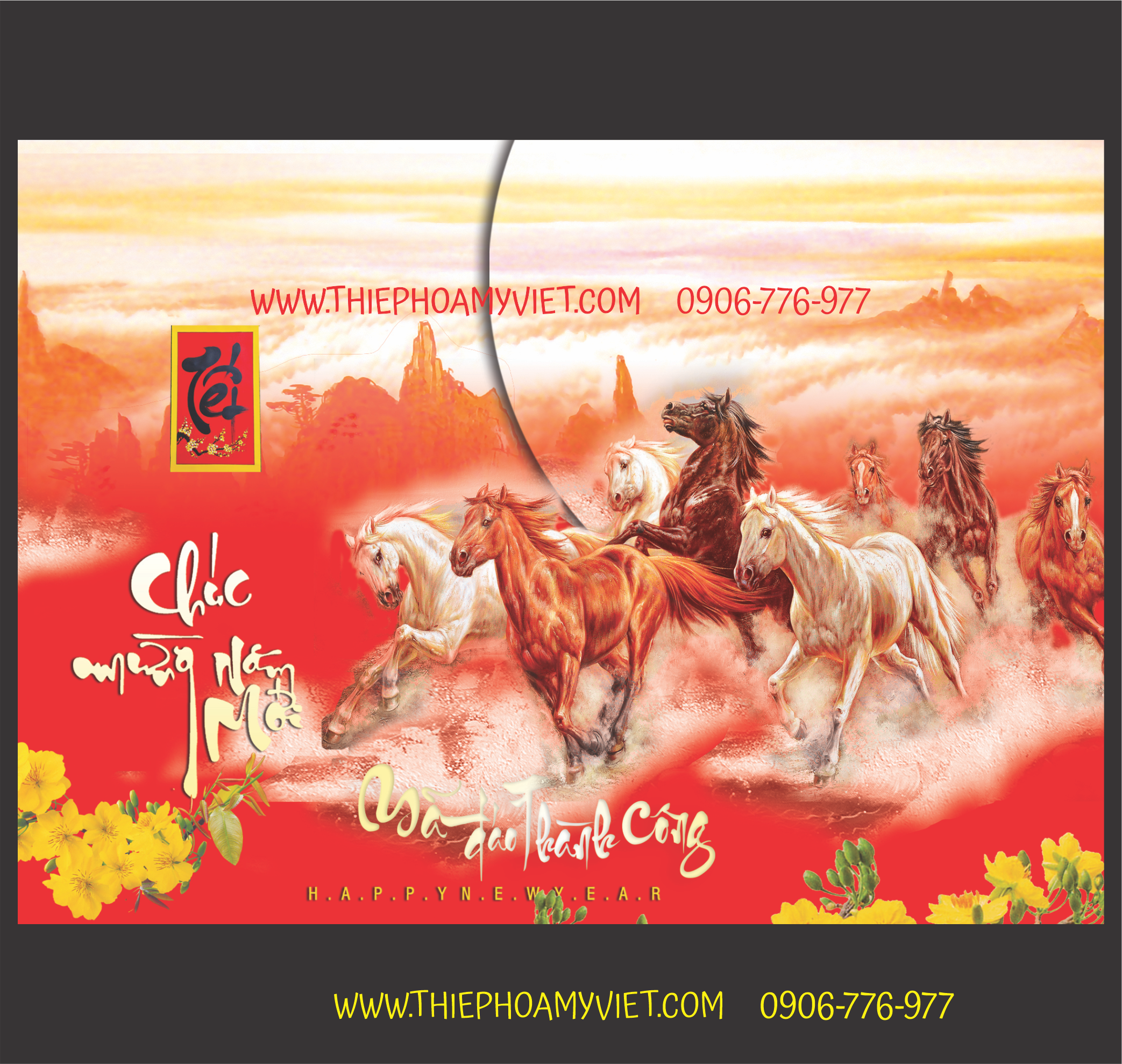 Thiệp chúc tết Bính Ngọ 2026 mẫu in lời chúc gửi thông điệp tới khách hàng. Nhận thiết kế thêm logo doanh nghiệp in mặt ngoài thiệp miễn phí