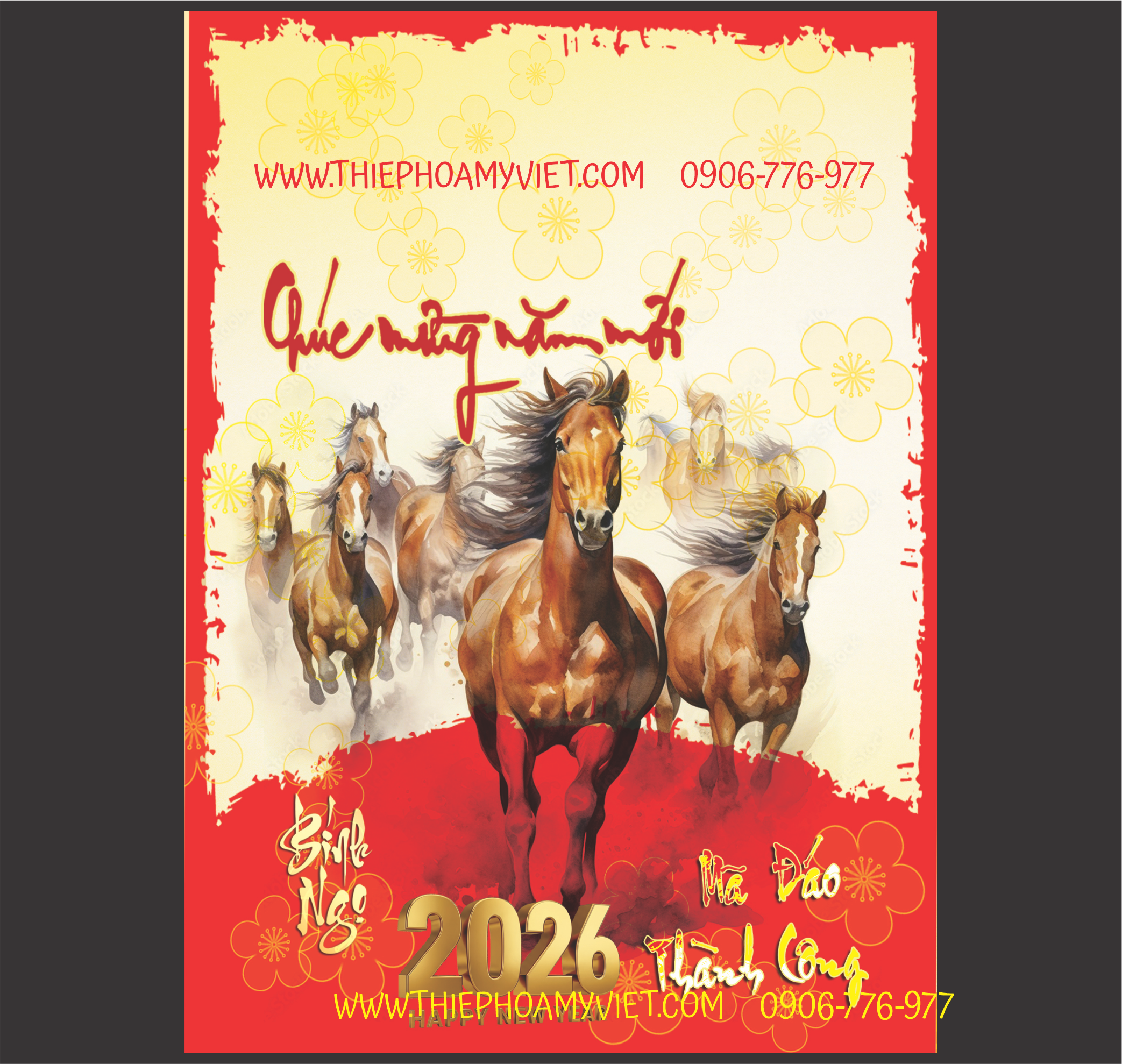Thiệp chúc Tết Bính Ngọ 2026 mẫu in lời chúc gửi thông điệp mã đáo thành công tới khách hàng. Nhận hỗ trợ thiết kế thêm logo in mặt ngoài thiệp, duyệt in có thiệp trong ngày