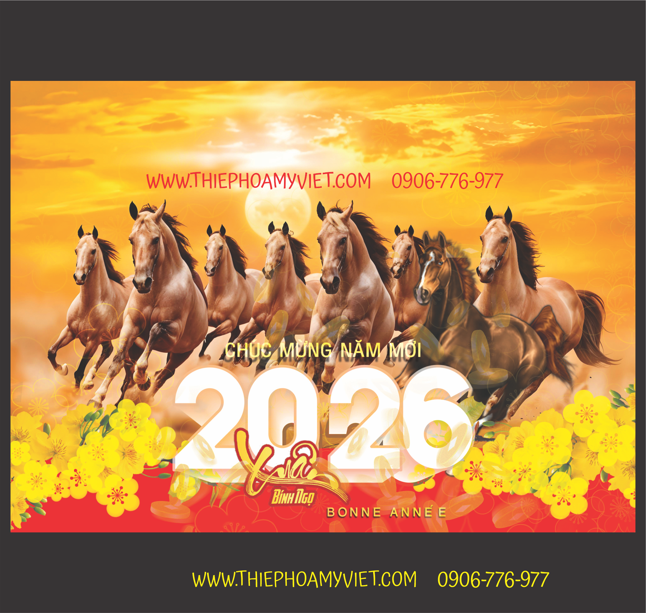 Thiệp chúc Tết năm Bính Ngọ 2026 in lời chúc thịnh vượng gửi tới khách hàng. Nhận hỗ trợ thiết kế thêm logo in mặt ngoài thiệp, duyệt in có thiệp trong ngày