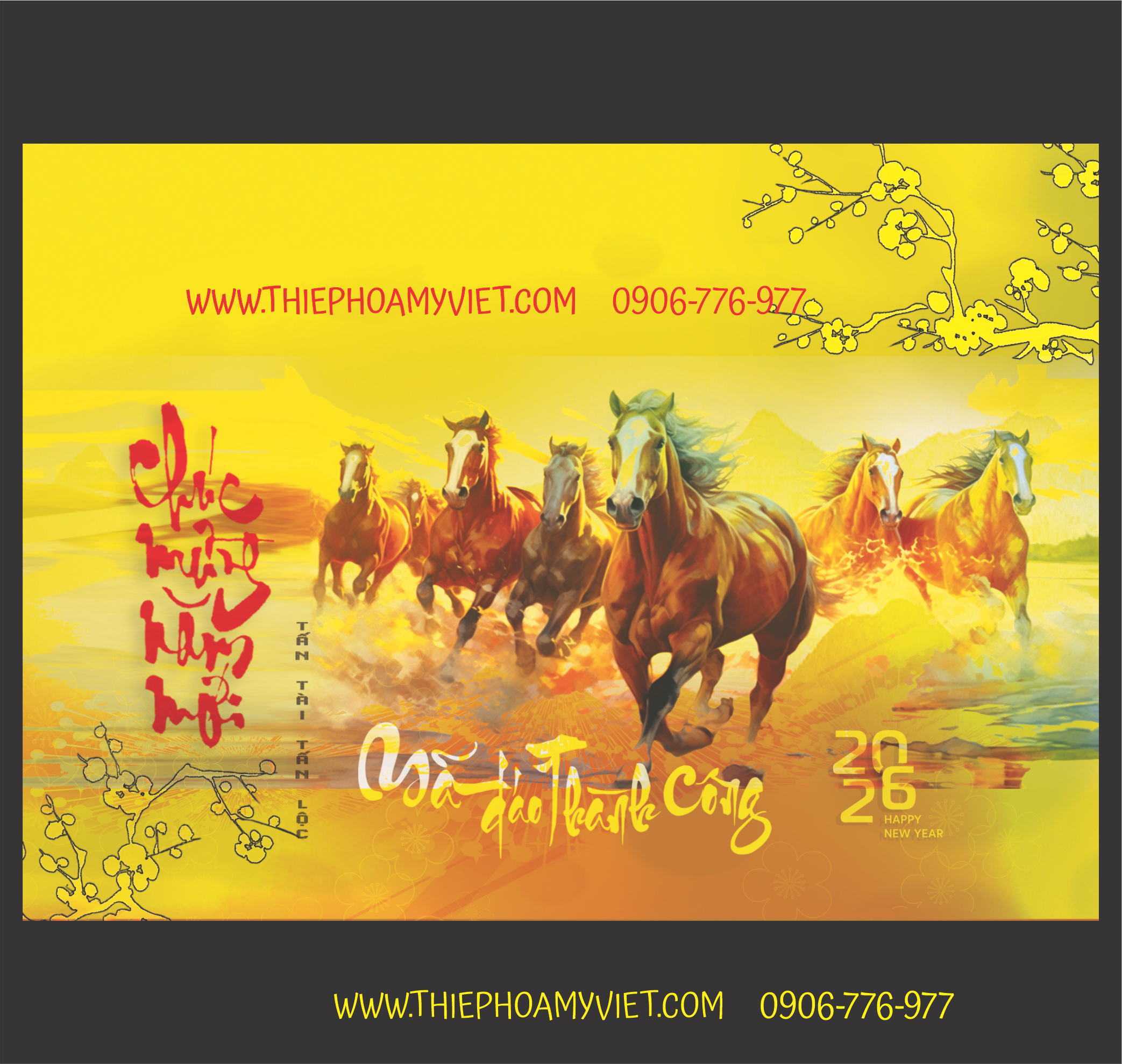Mẫu thiệp chúc tết năm bính ngọ 2026 cùng thông điệp mã đáo thành công gửi tới khách hàng, đối tác, nhận thiết kế thêm logo doanh nghiệp in mặt ngoài thiệp, nhận gửi mẫu mới qua email