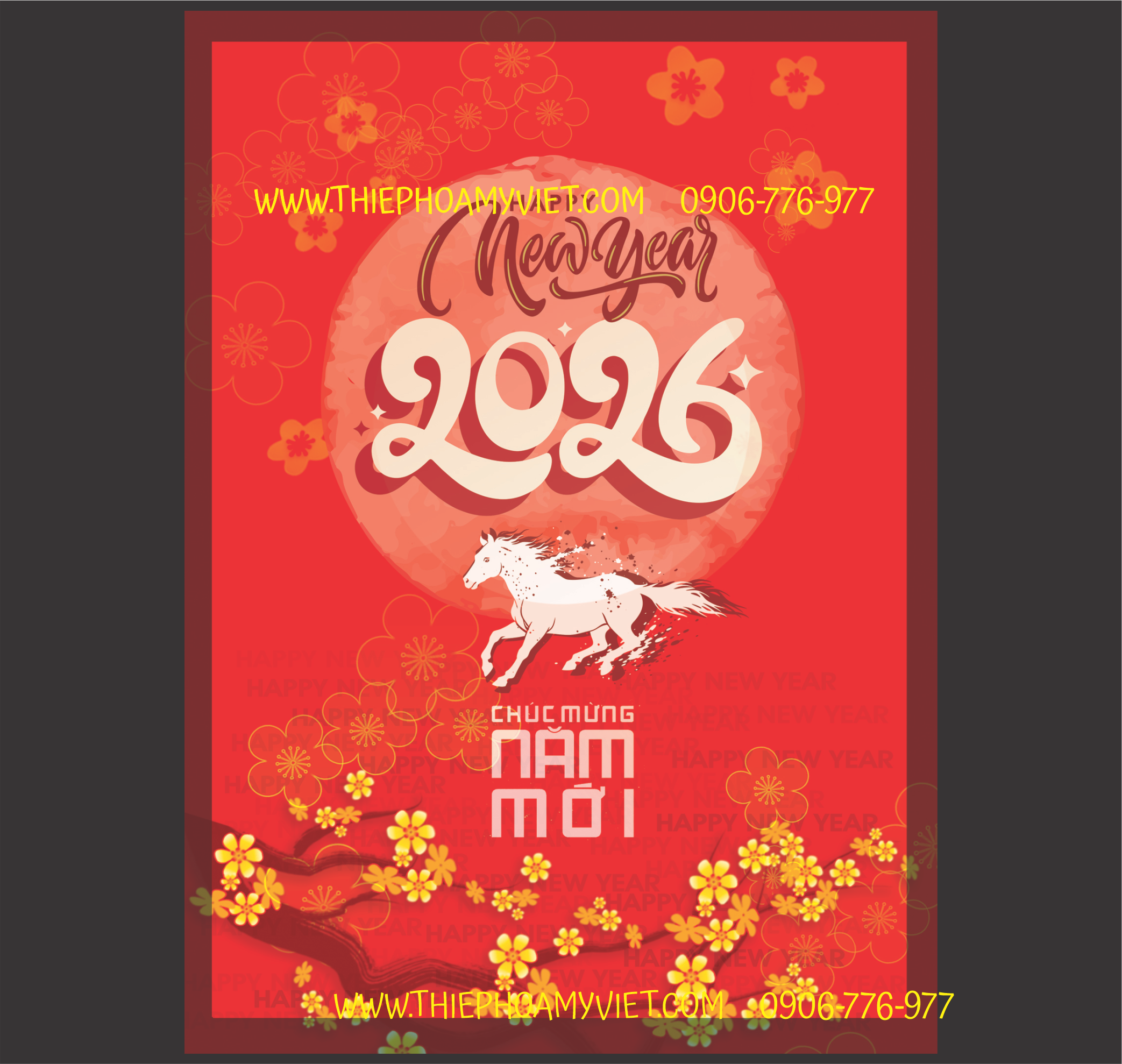 Thiệp chúc tết 2026 Bính Ngọ mẫu đẹp gửi thông điệp tới khách hàng. Nhận hỗ trợ thiết kế thêm logo in mặt ngoài thiệp, duyệt in có thiệp trong ngày