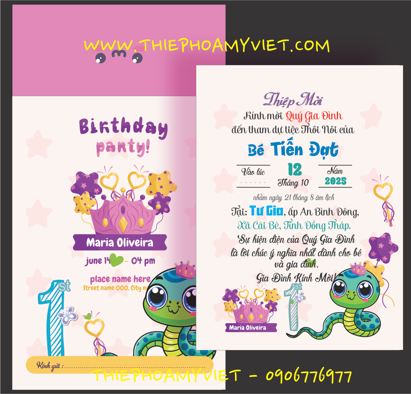 Thiệp mời thôi nôi 1 tuổi đánh dấu sự kiện đầu tiên từ khi bé có tuổi. Cha Mẹ chọn mẫu thiệp, in lời mời trên thiệp cả bao thư đầy đủ về chỉ còn ghi tên khách mời.